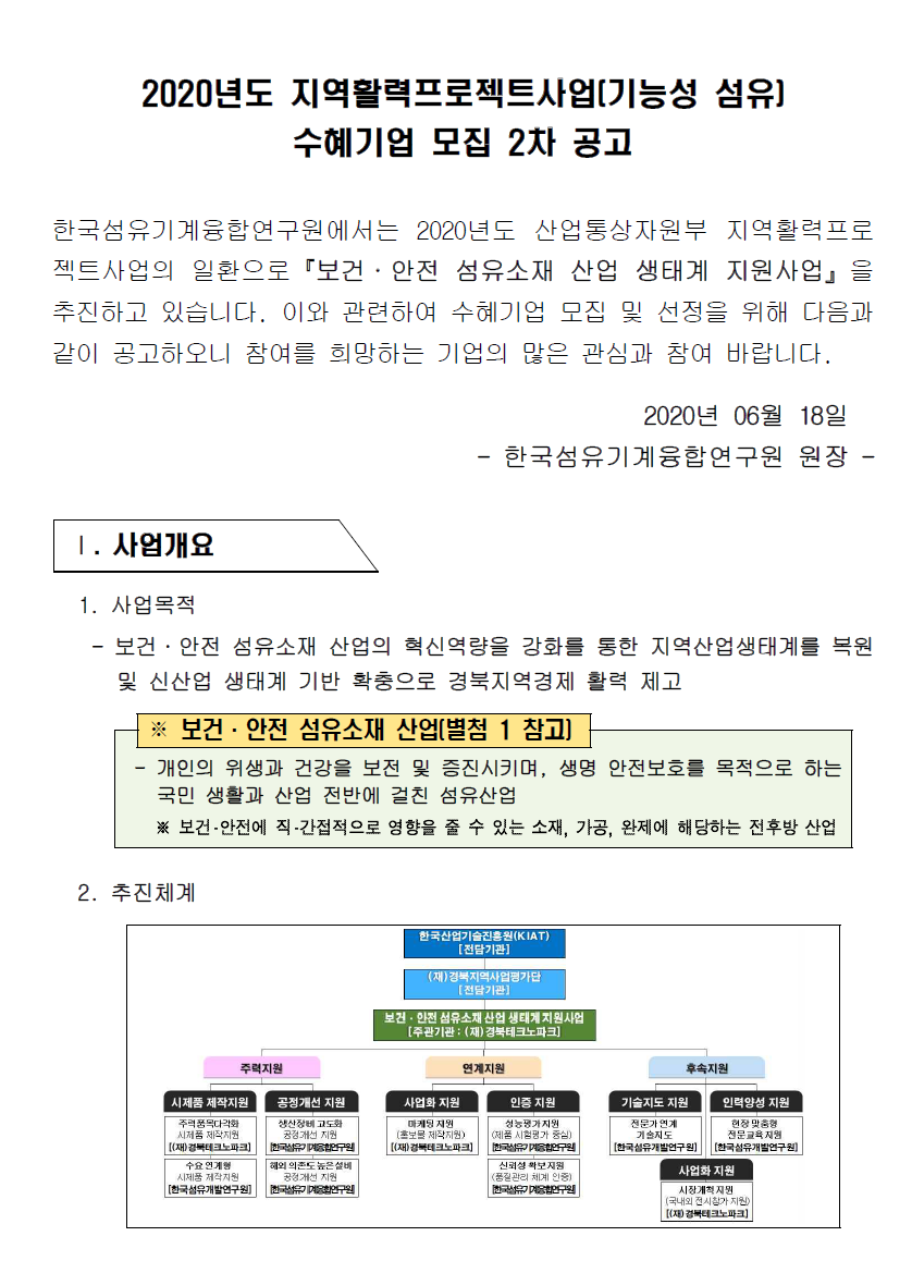 2020년도 프로젝트사업(기능성 섬유) 수혜기업 2차 추가모집 (~7/01(화)신청마감)