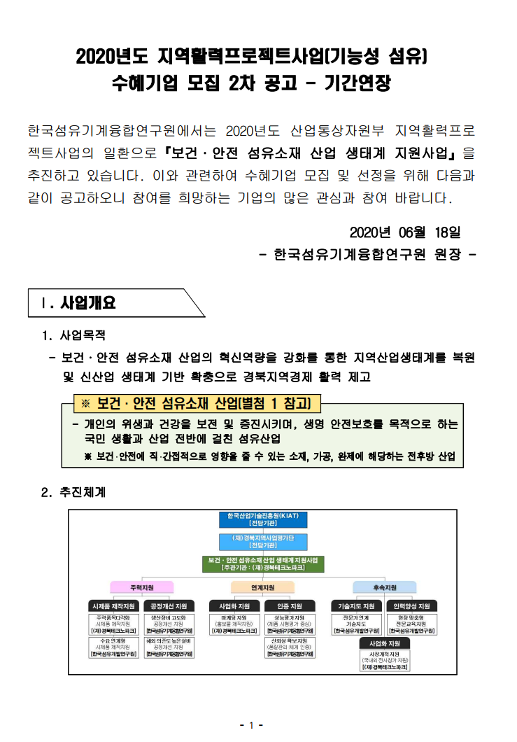 2020년도 지역활력프로젝트(기능성 섬유) 수혜기업 2차 모집 (기간연장, ~7/10)