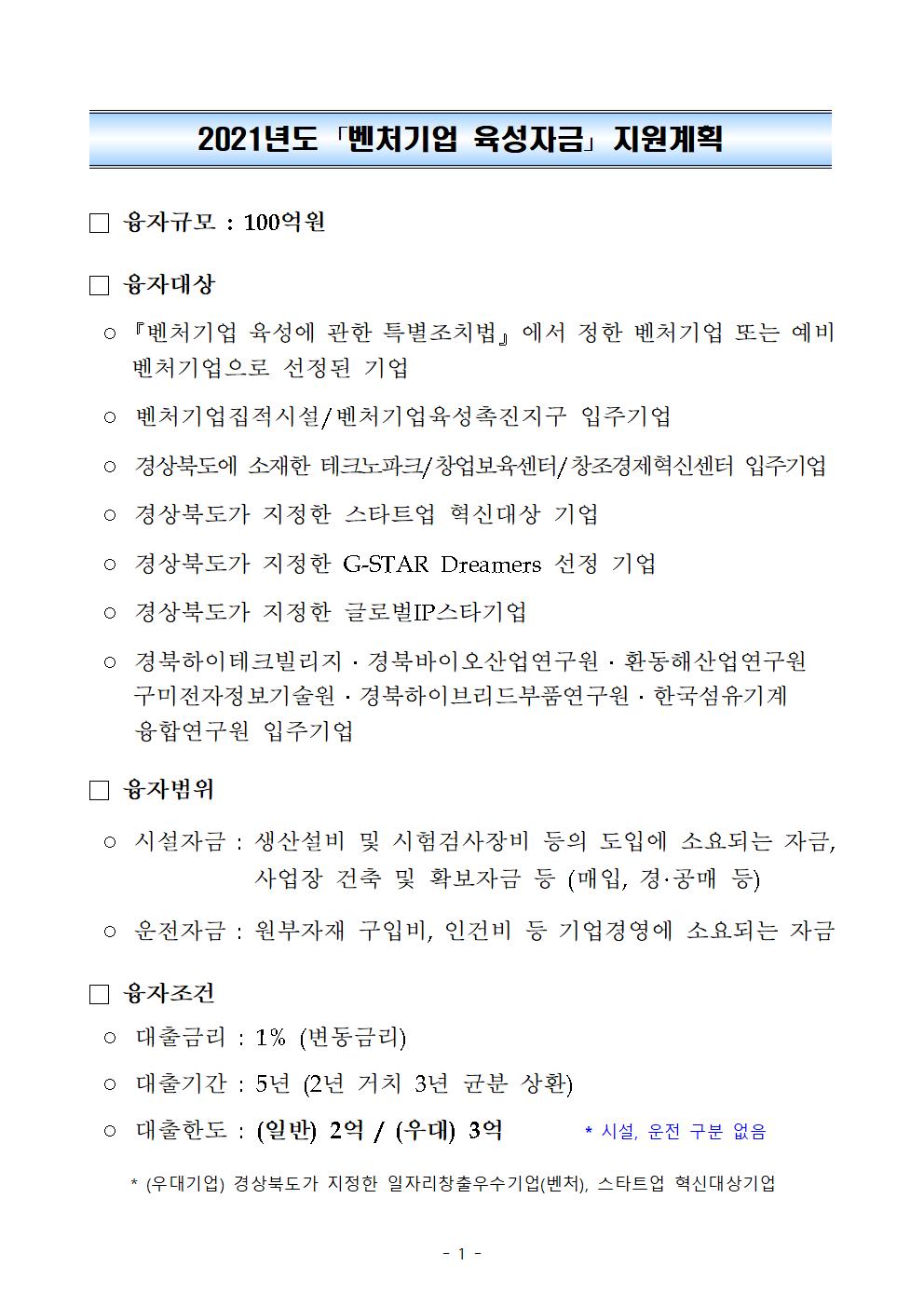 2021년도 「벤처기업 육성자금」 지원계획 안내
