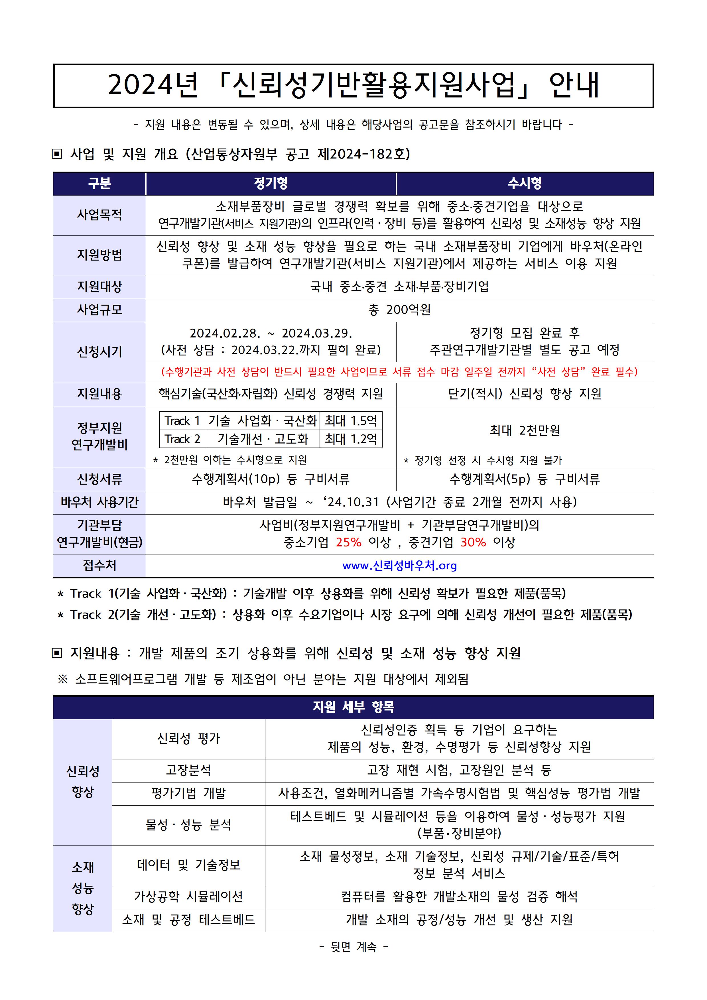 2024년도 신뢰성기반활용지원사업(정기형) 시행계획을 안내드립니다.