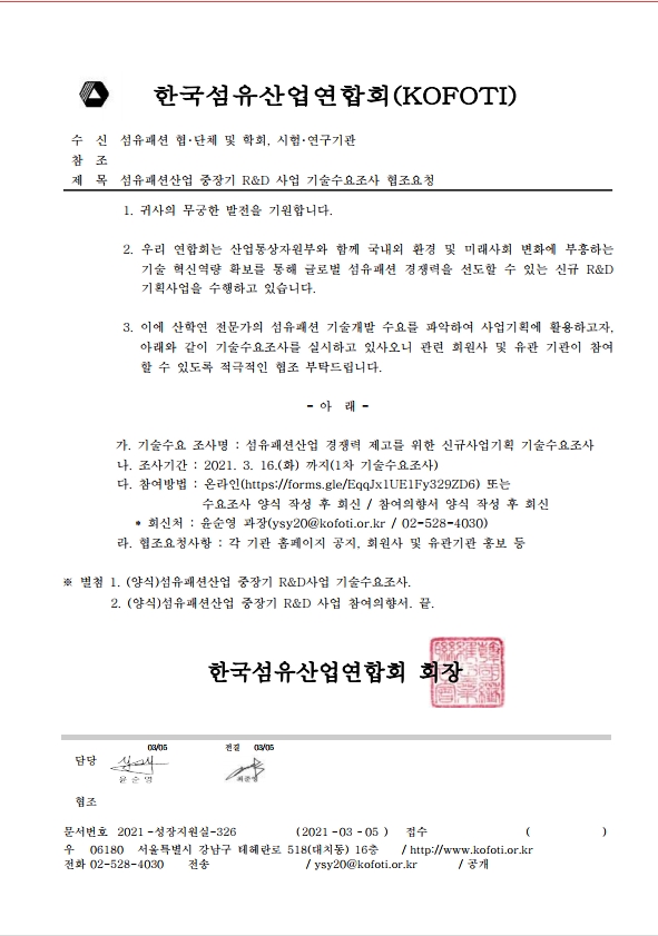 섬유패션산업 중장기 R&D 사업 기술수요조사 협조요청