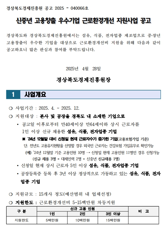 [경상북도경제진흥원] 2025년 신중년 우수기업 근로환경개선 지원사업 참여기업 모집공고